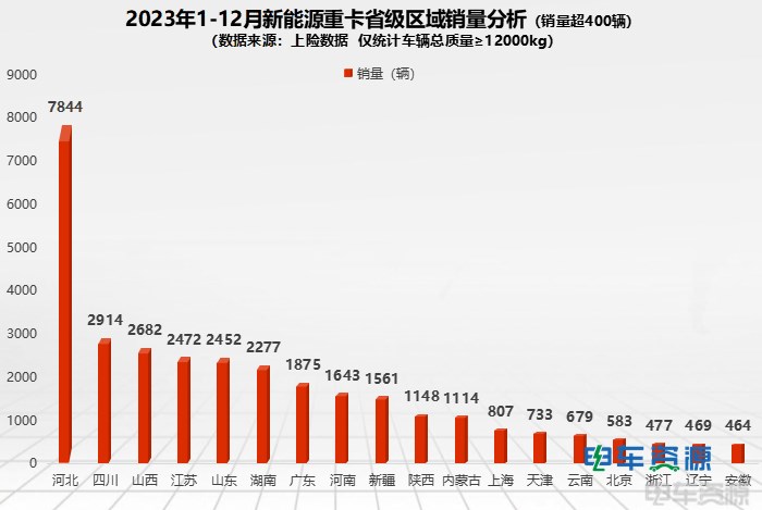 据电车资源数据,2023年1-12月新能源重卡在全国31个省市自治区有销售,其中销量超过1000辆的省市自治区有11个,分别是:河北省、四川省、山西省、江苏省、山东省、湖南省、广东省、河南省、新疆维吾尔自治区、陕西省、内蒙古自治区。