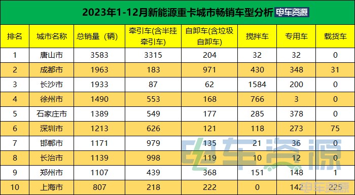 据电车资源统计(数据来源:上险数据,不含军车、出口车辆),在2023年1-12月新能源重卡共销售34560辆,同比增长35.65%。新能源重卡累计销量实现快速增长,其中12月销量达6278辆,创历史月销量新高。市场行情火爆,预计2024年销量将持续上涨。下面来看看2023年1-12月这些新能源重卡主要销往哪些城市呢?具体情况如何?【按GB/T 15089--2001《机动车辆和挂车分类》标准,以N3为车型分类标准,符合国家工信部新能源汽车规定,本文新能源重卡仅指整车总质量≥12000kg的纯电动重卡、燃料电池重卡、插电式(含增程式) 混合动力重卡车辆,包含牵引车(含半挂牵引车)、自卸车(含自卸式垃圾车)、载货车、搅拌车、专用车(环卫类与工程类等)等,不包含底盘、军车、出口车辆】