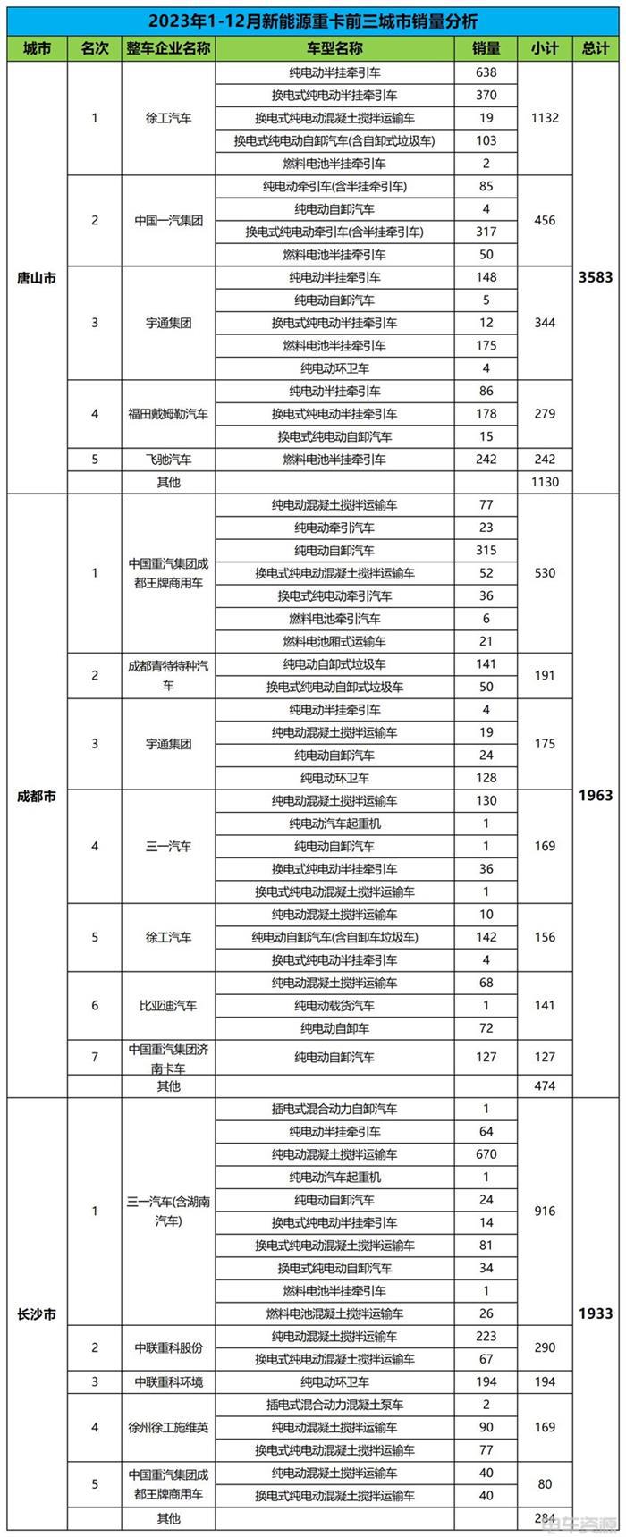 从城市的销量分析,2023年1-12月新能源重卡城市销量TOP10中,9城市销量超1000辆,前三城市销量超1900辆。唐山市以销售3583辆位居榜首。