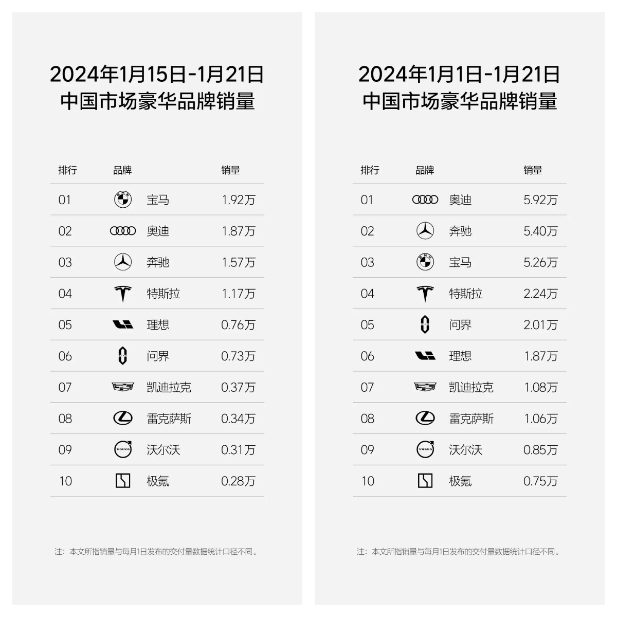 从前三周的销量情况来看,理想汽车总销量位居第二。1月1-21日销量表现来看,问界以2.01万辆的成绩位居第一,理想以1.87万辆的成绩位居第二,深蓝以0.98万辆的成绩位居第三。总体来看,问界和理想也是唯二销量破万的车企。