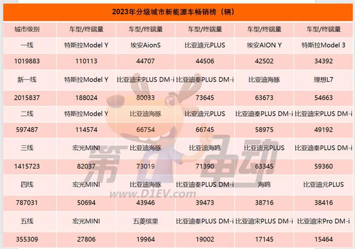 一线、新一线和二线城市最受欢迎的车型是特斯拉Model Y,而宏光MINI仍然是三线、四线、五线城市最受欢迎的车型。