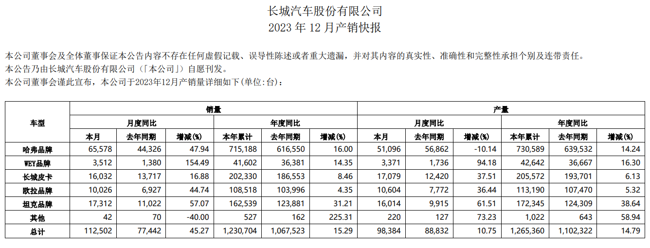 1月3日晚,长城汽车发布全年销量公告,公告称,长城汽车2023年12月销量为11.25万辆,同比增长45.27%;2023年累计销量为123.07万辆,同比增长15.29%。