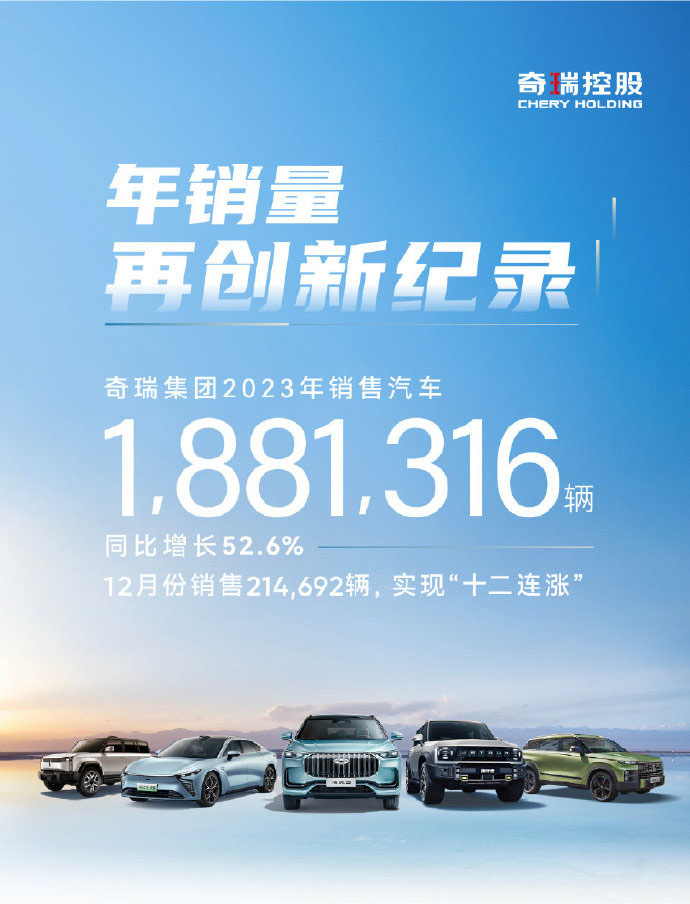 1月2日,奇瑞控股集团发布最新销量数据。12月,奇瑞集团销量215690辆,实现十二连涨。2023年,奇瑞集团全年销量1881316辆,同比增长52.6%,实现历史性突破。