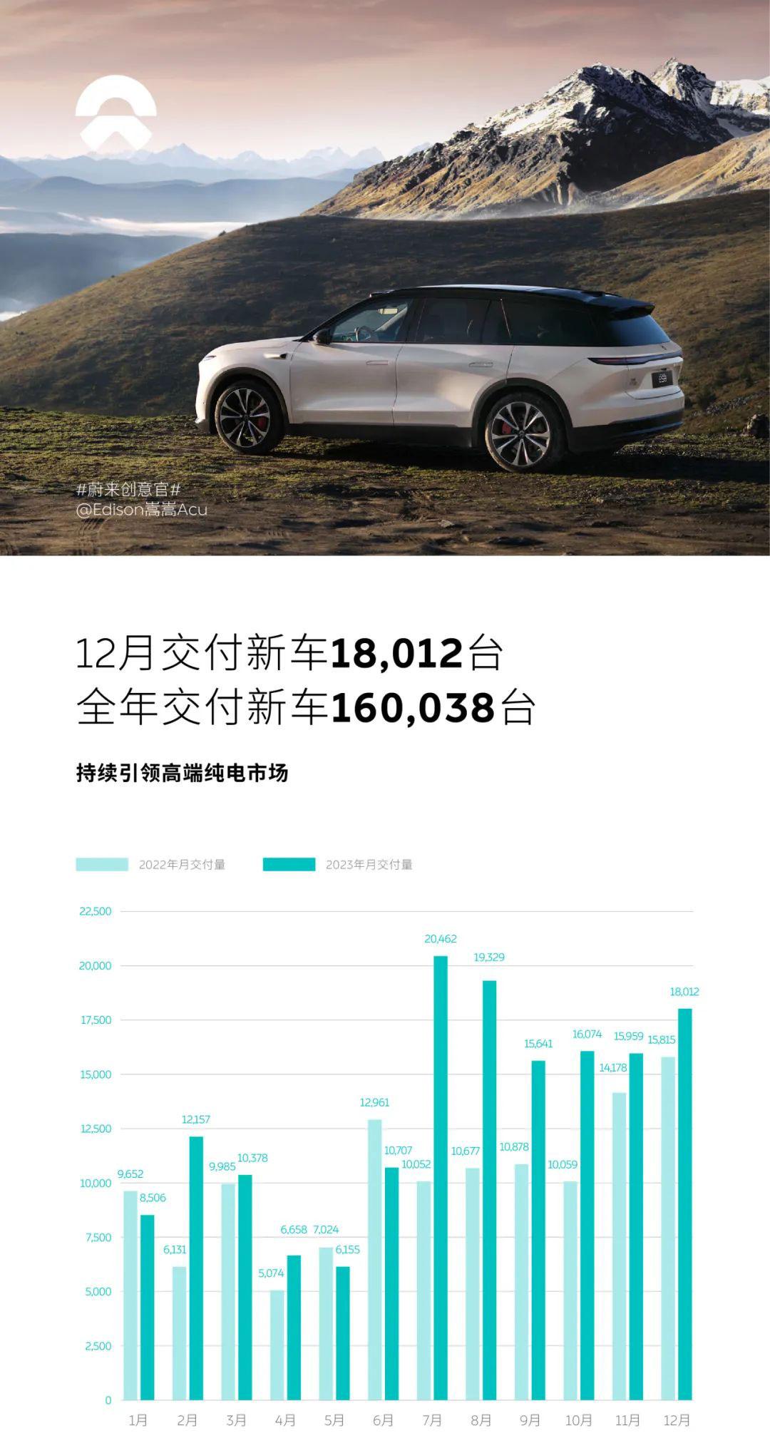 2023年12月,蔚来交付新车18012台,同比增长13.9%。2023年四季度,蔚来共交付新车50045台,同比增长25.0%;2023年全年,蔚来共交付新车160038台,同比增长30.7%。